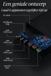 - Alles-in-Één Oplading: 6 poorten (3x USB-C + 3x USB-A) voor al je apparaten.